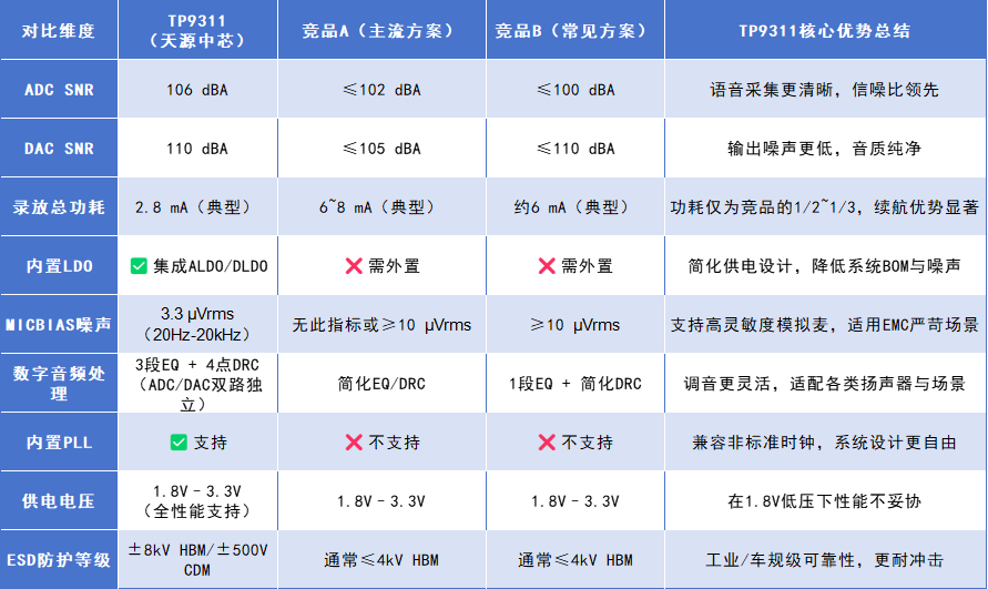 从上表可以看出,TP9311在音频性能、功耗、集成度、可靠性等方面均具备显著优势,是一款真正具备系统级竞争力的音频编解码芯片。